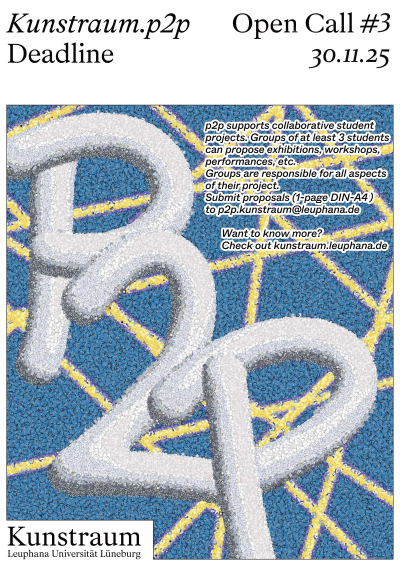 Kunstraum.p2p is a unique format designed to support independent and collaborative work by students. Kunstraum peer to peer offers space and resources for student groups (at least three people) to develop a project together. In addition to traditional exhibitions, alternative formats such as (artistic) workshops, film series, screenings, performances, or independent seminars are also possible. All interested groups are invited to submit their ideas as part of a biannual open call. Litha Sabelfeld, student assistant at Kunstraum, coordinates the groups.